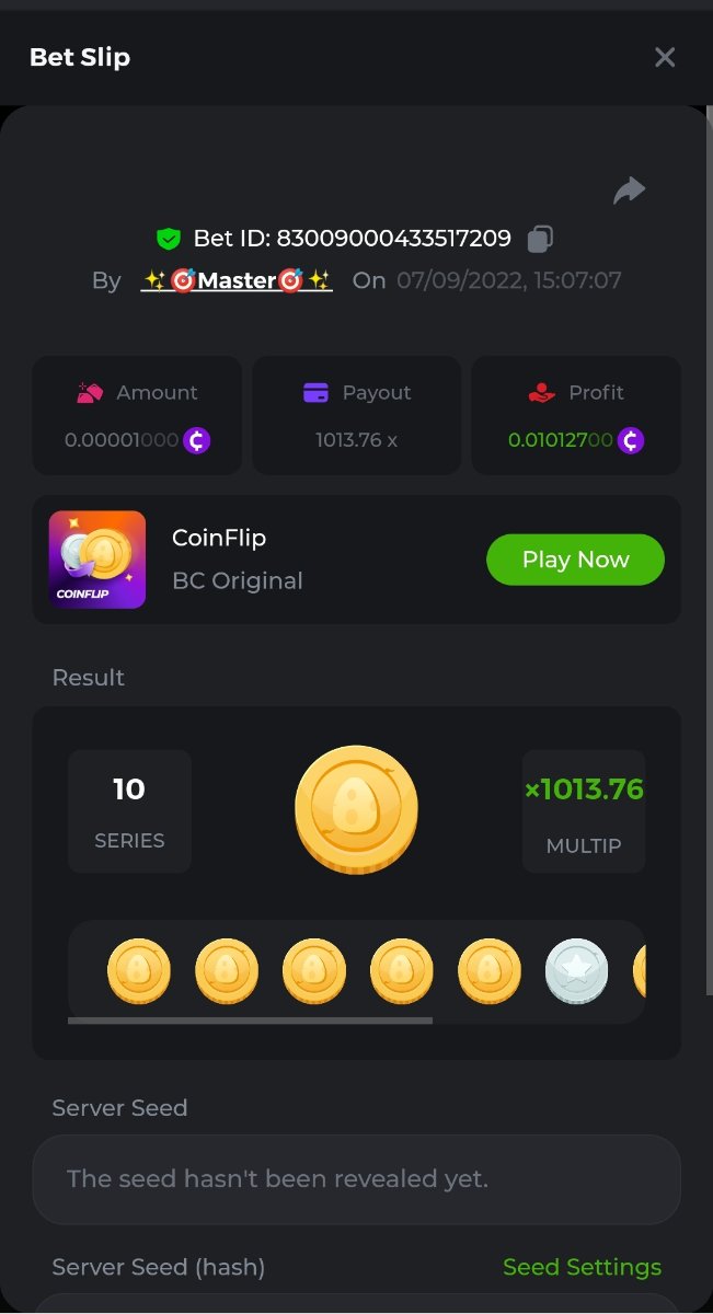 Black Tiger Posted September 7, 2022 Share Posted September 7, 2022 (edited) Read Carefully Before Start To Hunt Forum Challenges #7 : CoinflipHunt :Win the highest pay outMin Payout requirement 100xMin Level 4️Duration Starting : Now End time : 23.59 UTC Time How to Join? Only Post on BC.Game Telegram Official HERE Make screenshot + paste your bet link + Hashtag #daily_challenges To get bet link can check HERE Any coin allowedReward Prizes 1st Place....... $7 BCD2nd Place..... $5 BCD3rd Place...... $4 BCD 🎖4th Place......$3 BCD5th-10th Place......$1 BCD 🏵 Winners will be announcing next day after Roll Point ========================== On Going Event $4,000 Top Tier Playtech Multiplier Battle! $2,500 Keno Multiplayer Challenge #45 E-sports Show off & Grab 300$ !$250 BC.GAME SPORTS PARLAYS CHALLENGES #19$500,000 Spinomenal's Grand Holiday Tournament $162,000 Tournament by Spadegaming!Forum Daily ChallengesDiscord Daily CHallengesTelegram Daily Challenges Edited September 7, 2022 by Black Tiger Link to comment Share on other sites More sharing options...