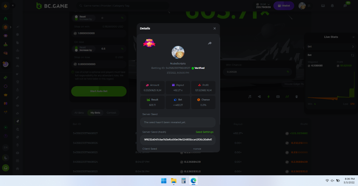 NubsScripts Posted March 4, 2022 Share Posted March 4, 2022 Interesting that a straight betting pattern with no variations is the best strategy. Gaps and Stacks player, gaps and stacks. You don't need to keep betting a normal bet when nothing is around. Bet minimum amount then. If you miss a big Payout, no problem, it will come around again. If it doesn't come when triggers are met then take the small loss, reduce bet and try again. By minimizing the losses, the profit becomes bigger. Change your Multiplier as often as your bet. Link to comment Share on other sites More sharing options...